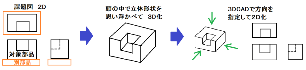2D CADの場合は下記のように、2Dの課題図から対象部品だけを抜き取って立体形状を頭に浮かべながら問題文で指示された投影方向の図を描いていきます。